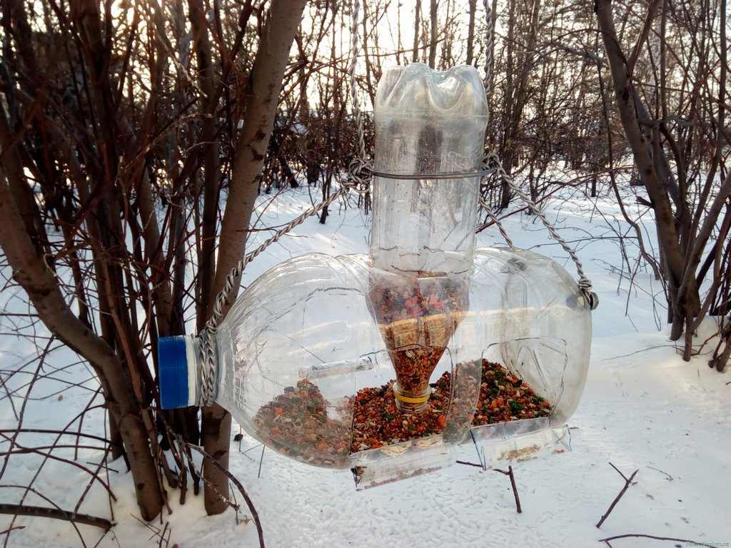 Що потрібно: велика пляшка (основа) + менша (бункер), ніж, дріт або мотузка, піддон (його можна вирізати з пластику).
