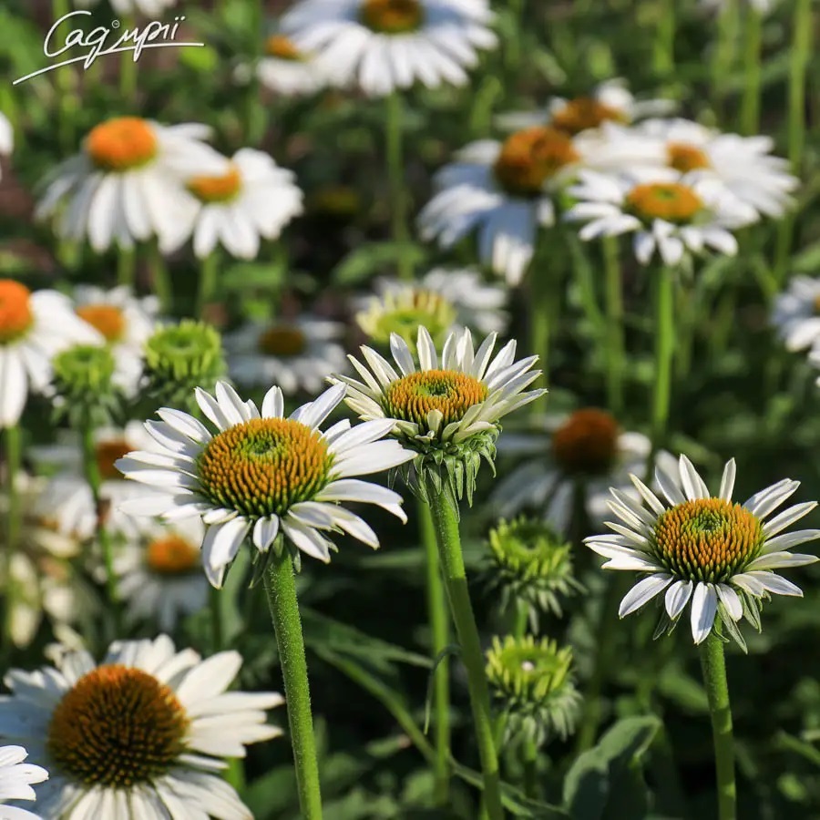 Ехінацея пурпурна 'White Swan' - один з найпопулярніших сортів ехінацеї пурпурової. Красивоквітуча лікарська рослина, розростаючись, утворює кущики висотою 60-80 см і до 60-65 см в ширину. Характерною особливістю сорту є великі суцвіття - кошики діаметром до 10 см, білого кольору з горизонтально розташованими язичковими пелюстками. Стебла прості, прямостоячі, міцні, коричневого кольору. Листя ланцетні, з зубчастим краєм насиченого зеленого кольору. Цвіте з липня по серпень. Плоди ехінацеї чотиригранні бурі сім'янки. Світлолюбна.