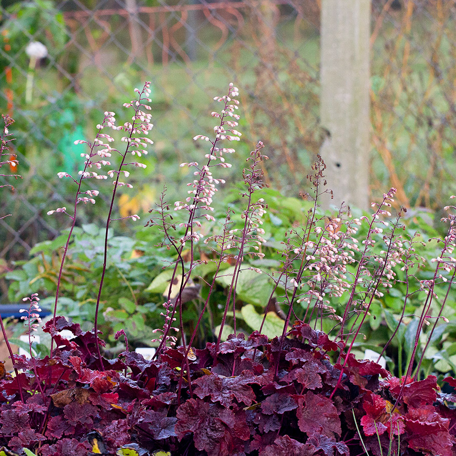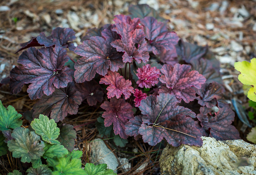 Полив - помірний. У перший сезон — регулярний, надалі — у посуху. Поливайте під корінь, уникаючи заливання центра розетки. Гейхера краще переносить коротке підсушування, ніж перезволоження. Підживлення: навесні внесіть компост або невелику дозу комплексного добрива. За потреби в середині літа можна повторити легке підживлення, але без надлишку азоту, щоб рослина не «жирувала» і не втрачала насиченість кольору. Мульчування: шар 3–5 см допомагає підтримувати стабільну вологість, зменшує перегрів коренів і перешкоджає розмиванню ґрунту. Раз на 3–4 роки кущ бажано поділити, робити це краще навесні або наприкінці літа. Це підтримує щільність розетки та стимулює появу молодого, яскравого листя.
