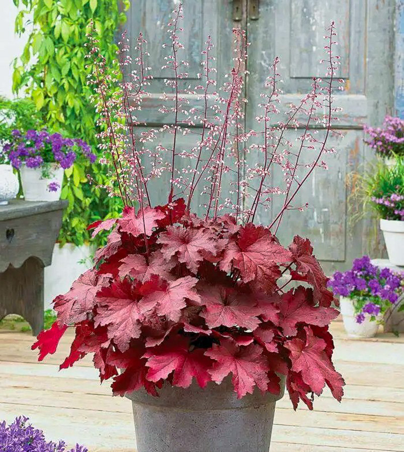 Гейхера ‘Cajun Fire’ — яскрава декоративно-листяна багаторічна рослина, що формує щільну розетку з великих хвилястих листків насичених теплих відтінків. Молоде листя часто має вогняно-червоний або мідно-помаранчевий тон, згодом переходить у глибокі бордово-червоні й шоколадні нюанси, а нижній бік листка нерідко залишається пурпуровим. Завдяки такій «палаючій» палітрі ‘Cajun Fire’ працює як сильний акцент у тіні та напівтіні, чудово поєднується з хостами, папоротями, астильбами, бруннерами, гейхерелами, декоративними злаками та хвойними. Підходить для міксбордерів, бордюрів, контейнерів і озеленення під кронами дерев. Кущ компактний, акуратний, у середньому 25–35 см заввишки (листя) і 30–45 см завширшки. У період цвітіння над розеткою піднімаються тонкі квітконоси до 45–60 см, з дрібними дзвоникоподібними квітками (забарвлення залежить від умов, частіше кремове або світло-рожеве). Основна цінність сорту — декоративне листя, яке зберігає привабливість з весни до пізньої осені, а за м’яких зим може частково залишатися зеленим. ‘Cajun Fire’ додає композиціям глибини кольору й «тепла», особливо в тінистих куточках саду, де яскравих фарб зазвичай бракує.