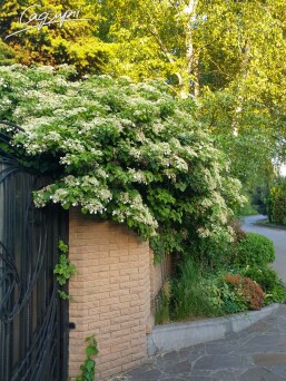 Повзучий чагарник, стелеться по землі, густий, утворює куртини або підіймається по деревах і стінах, злегка в'ється завдяки корінню-присоскам, в молодості росте повільно. На деревах і стінах досягає висотою до 10-15 м. Висаджений поодиноко, утворює густі, висотою до 1,5 м кущі. Плоскі, білі зонтичні суцвіття шириною до 25 см, по краях розташовані сніжно-білі солодкувато пахнуть квітки. Цвіте з червня по липень. Листки листопадні, овальні, довжиною 6-10 см, зверху блискучі, темно-зелені, знизу світліше, трохи шкірясті, жирні, дуже довгий держак (до 15 см); осіннє забарвлення жовте. Віддає перевагу вологим, гумусним, проникним, родючим, кислим або нейтральним ґрунтам, слід уникати вапняних. Переносить кореневий тиск, але не ущільнення грунту. Віддає перевагу злегка притінені місця. Вимагає високої вологості повітря, переносить радикальну обрізку до старої деревини. Морозостійкий, але в суворі зими може підмерзати. Використовують для озеленення пергол, стін, дерев і на опорах, а також як солітер.