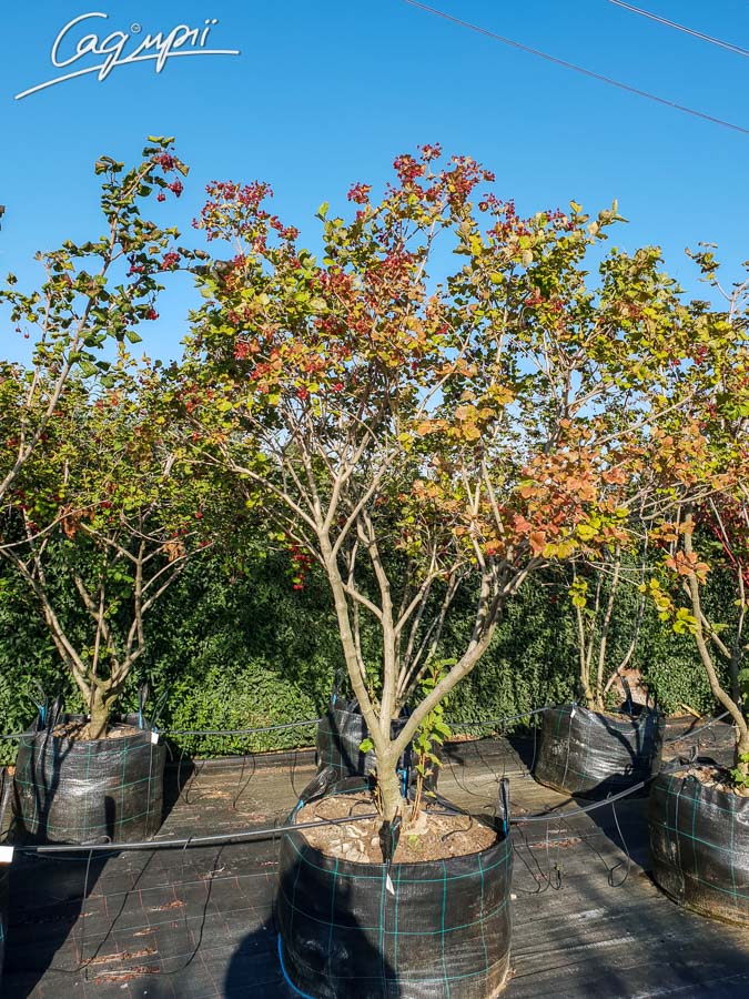 Листопадний розлогий, великий чагарник, росте швидко. У дорослому віці у висоту і ширину становить 3-4 м. Численні білі квітки зібрані в щитковидні суцвіття; цвіте в травні-червні. Листки світло-зелені, з нижньої сторони сіро-зелені, опушені, осіннє забарвлення винно-червоне або темно-червоне. Віддає перевагу свіжим, вологим, родючим, від слабо кислих до сильно лужних, вапняним ґрунтам. Світлолюбна, виносить півтінь, потребує руху повітря, інакше може сильно постраждати від попелиці. Дуже морозостійка і помірно вологолюбна рослина.