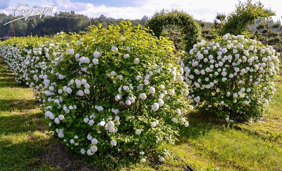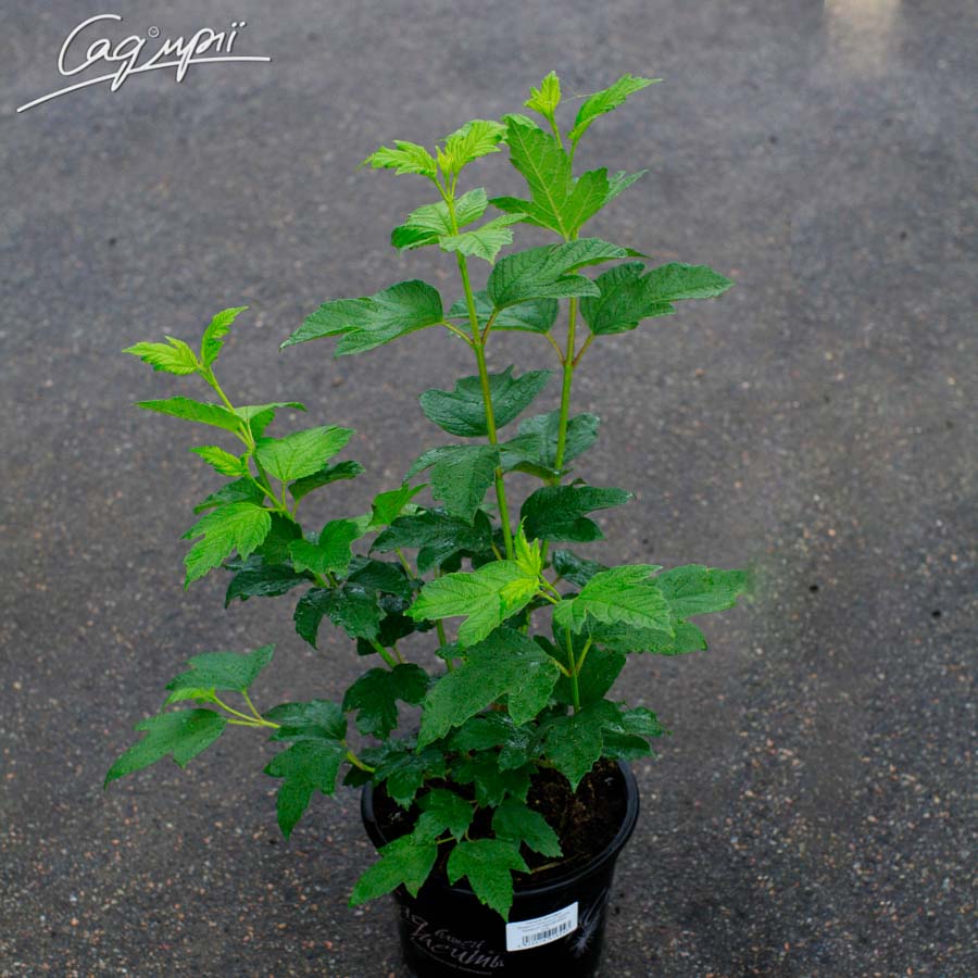 Листопадний розлогий, великий чагарник, з віком зовнішні гілки злегка звисають вниз; росте швидко. У дорослому віці у висоту і ширину становить 3-4 м. Численні білі, кулясті суцвіття, при відцвітанні злегка рожеві, діаметром 8 см; цвіте в травні-червні. Листки схожі на Кленові, 3-5 - лопатеві, 8-12 см завдовжки, світло-зелені, з нижньої сторони сіро-зелені, опушені, осіннє забарвлення винно-червоне або темно-червоне. Віддає перевагу свіжим, вологим, родючим, від слабо кислих до сильно лужних, вапняним ґрунтам. Світлолюбна, виносить півтінь, потребує руху повітря, інакше може сильно постраждати від попелиці. Морозостійка, вітростійка, утворює кореневі нащадки. Виносить радикальну омолоджуючу обрізку. Придатна для вигонки. Використовують як солітер в садах і парках, змішаних живоплотах, місце їй знайдеться в кожній садибі.