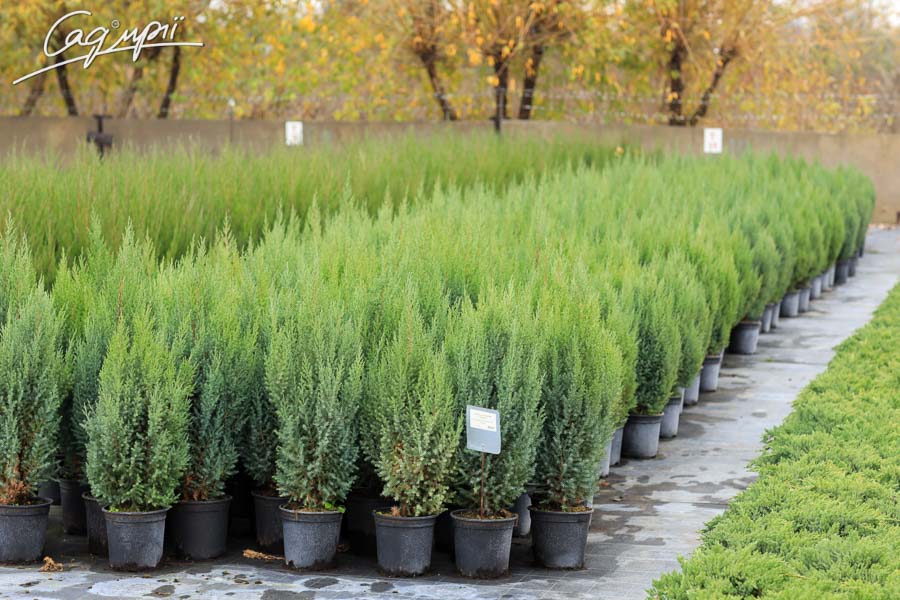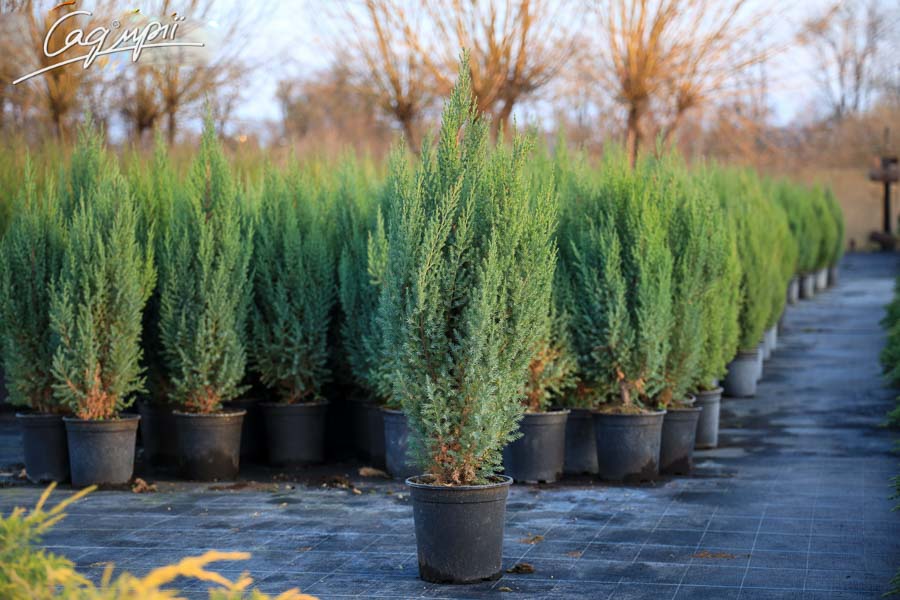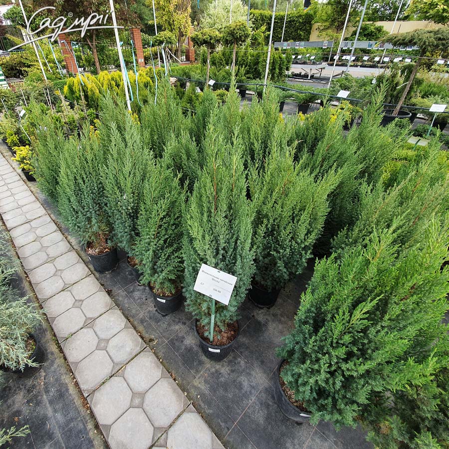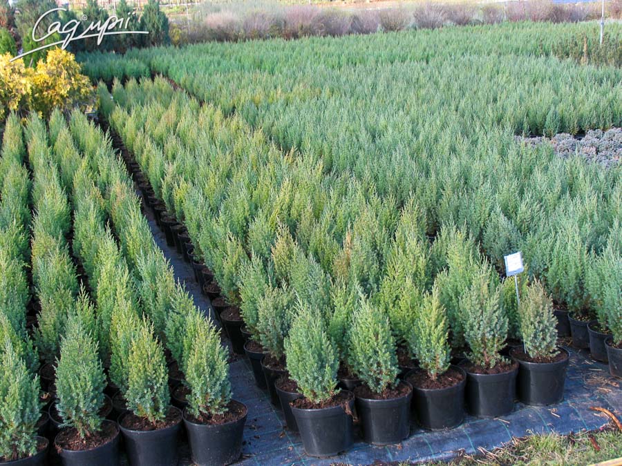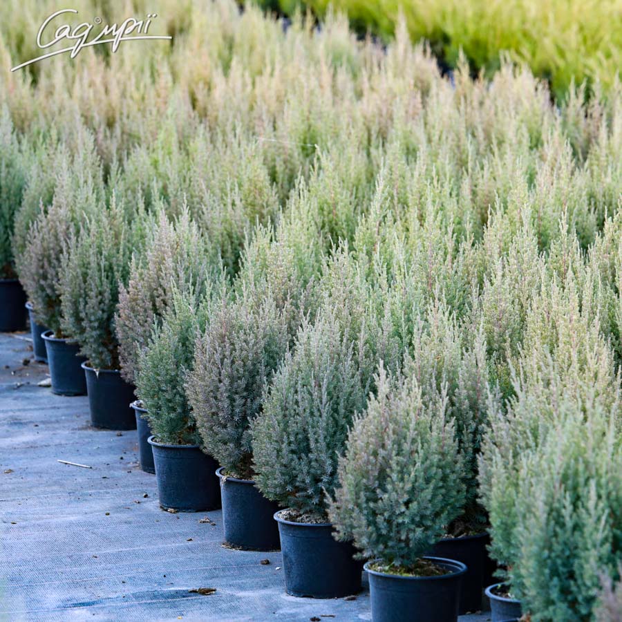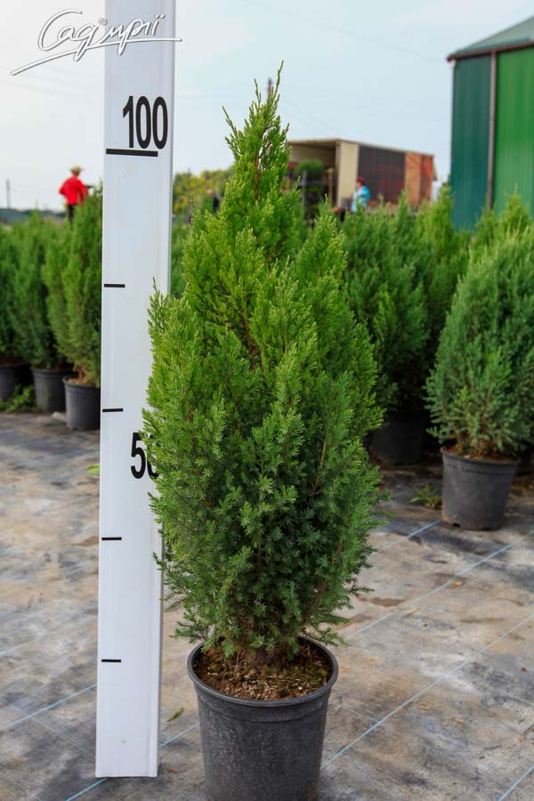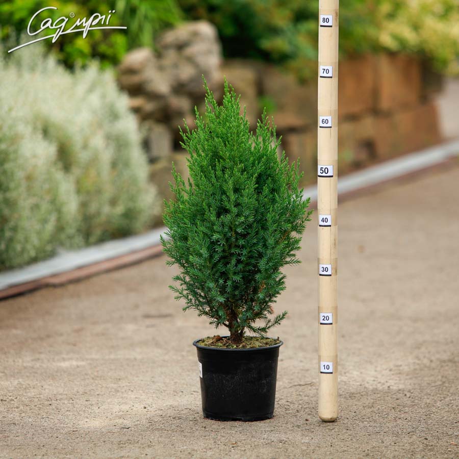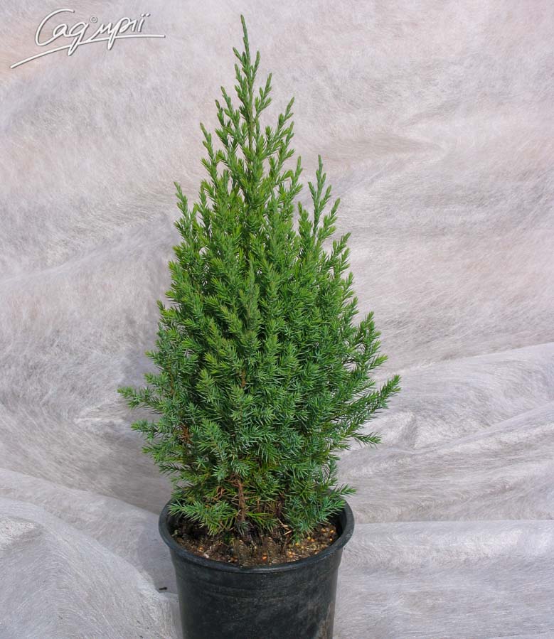 Чагарник з конусоподібною кроною і густими, вертикально зростаючими гілками. Росте повільно. Висота дорослої рослини 3,5 м, ширина – 1,5 м. Хвоя колюча синьо-зелена в зимовий час набуває сталевий відтінок. Плоди-фіолетово-коричневі шишкоягоди. Сонцелюбний, в той же час переносить півтінь. Зимостійкий. Рослина до грунтів невимоглива, росте як на слабокислих, так і на слаболужних грунтах. Підходить для озеленення дахів, балконів, лоджій і терас в якості контейнерної культури, а також в якості живої огорожі.