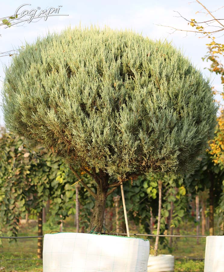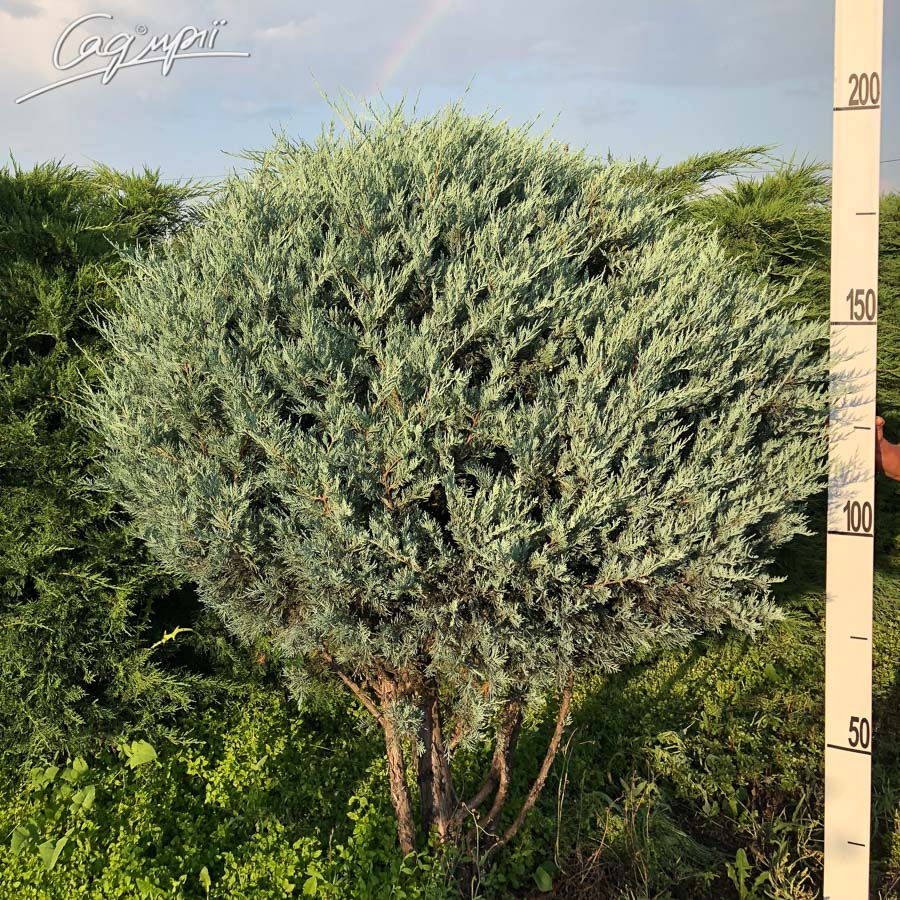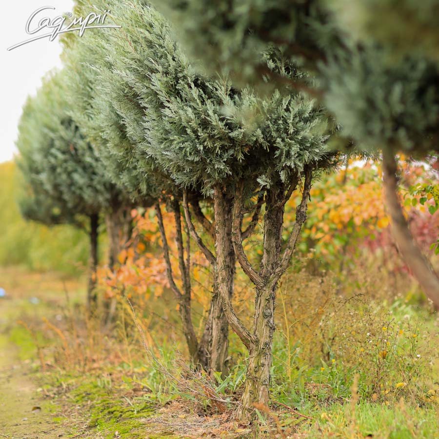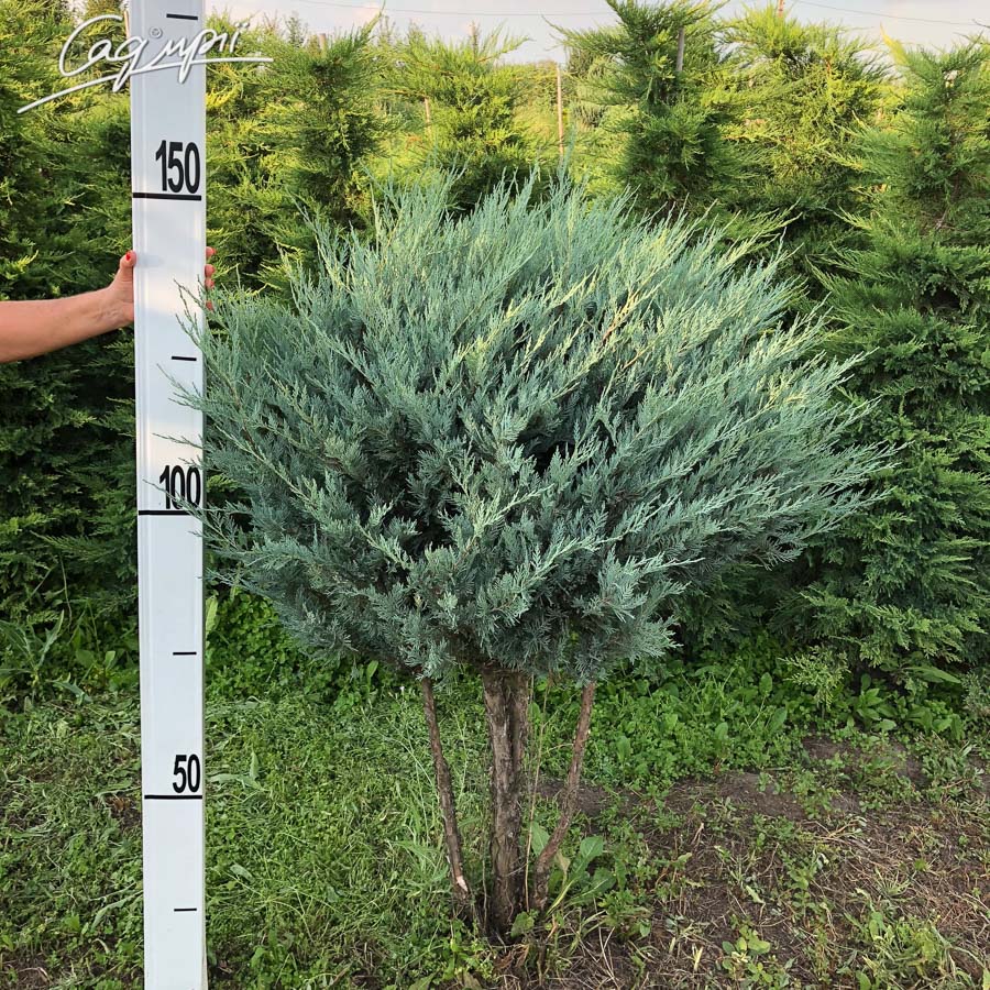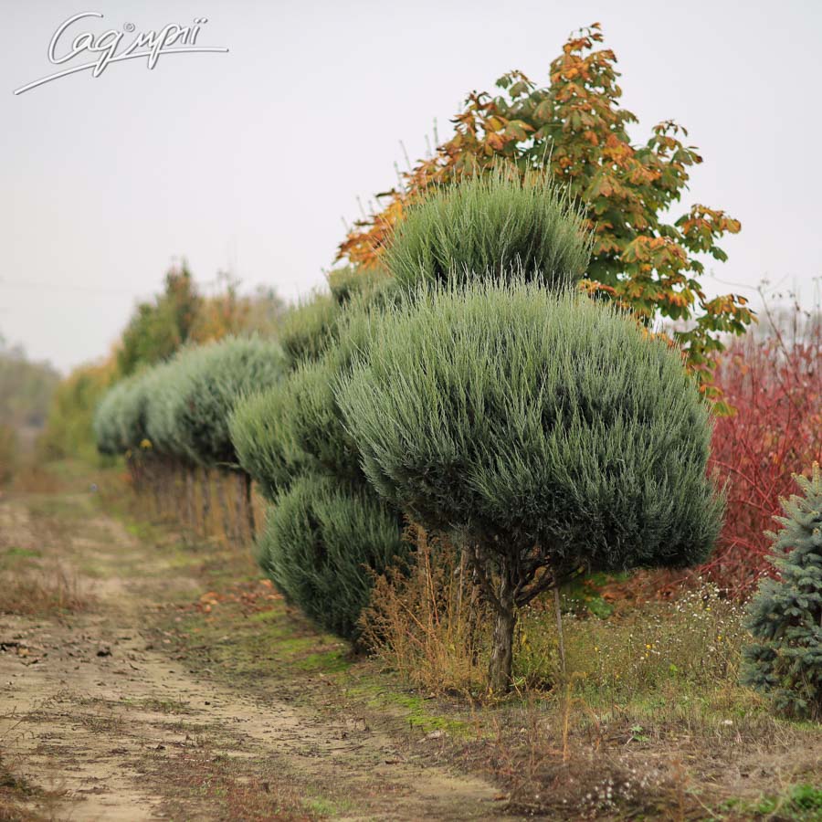 Строго вертикальна, колоновидна форма, з вертикальними гілками і густими прилеглими пагонами. Хвоя голчаста або луската, дуже красивого небесно-блакитного кольору. Висота 6 - 8 м, ширина – до 1,5 м. Швидкість росту висока; річний приріст у висоту 20 см, завширшки до 5 см. Солнцелюбивий. Добре росте на свіжих, добре дренованих, не дуже родючих, грунтах, виносить засолення. Зимостійкий. Використовується в якості вертикального елемента в альпінаріях, на газонах і в контрастних ландшафтних композиціях. Ідеальна рослина для дикорослого живоплоту, яка практично не вимагає догляду, в якості вертикального елемента в садових композиціях.