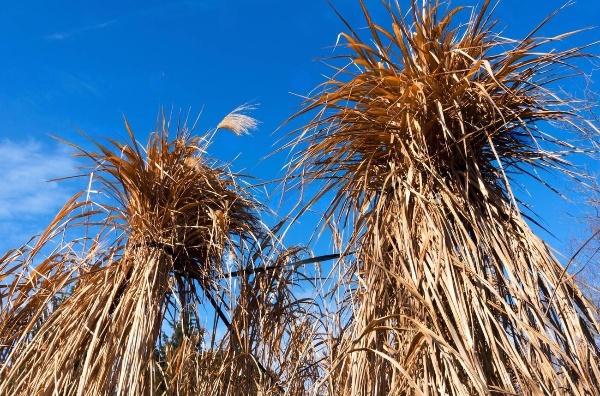 - Мискантусы или другие высокие растения удобно срезать, связав предварительно в пучок (или несколько, если куст очень большой)