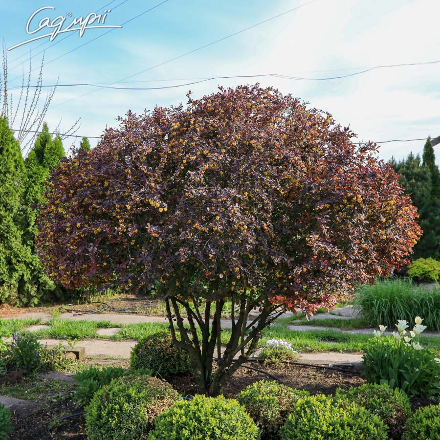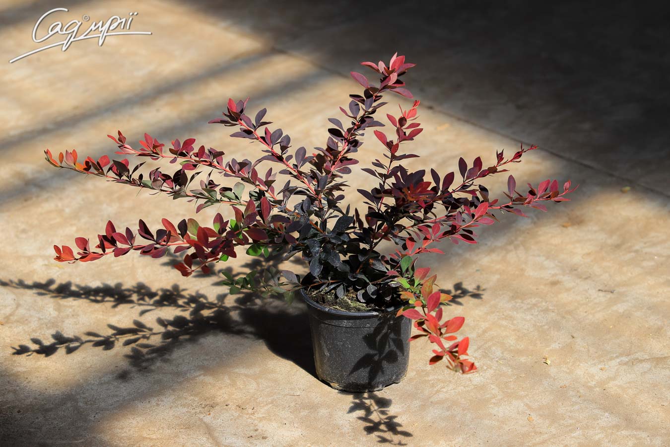 Листопадный высокий кустарник с сильными вертикальными скелетными ветвями, с возрастом дугообразно отклонёнными. Достигает как в высоту, так и в ширину 4м. Кора красно-коричневая с острыми шипами. Листья смотрятся эффектно на протяжении всего сезона: крупные, округлые, длиной 3-5 см., тёмно-красные с голубоватым блеском. Осенняя окраска от оранжевой до светло-красной. Цветы - желтые, на длинных стеблях. Время цветения - май. Овальные светло-красные ягоды сохраняются на ветвях на протяжении всей зимы. Корневая система поверхностная, хорошо разветвлена, с большим количеством тонких корней. Нетребователен к почве, хорошо будет расти на сухих как кислых, так и щелочных. Предпочитает солнечное местоположение, где окраска листвы будет более насыщенной, вместе с тем теневынослив. Идеален в качестве живой изгороди, в качестве яркого цветового акцента на заднем плане ландшафтных композиций.