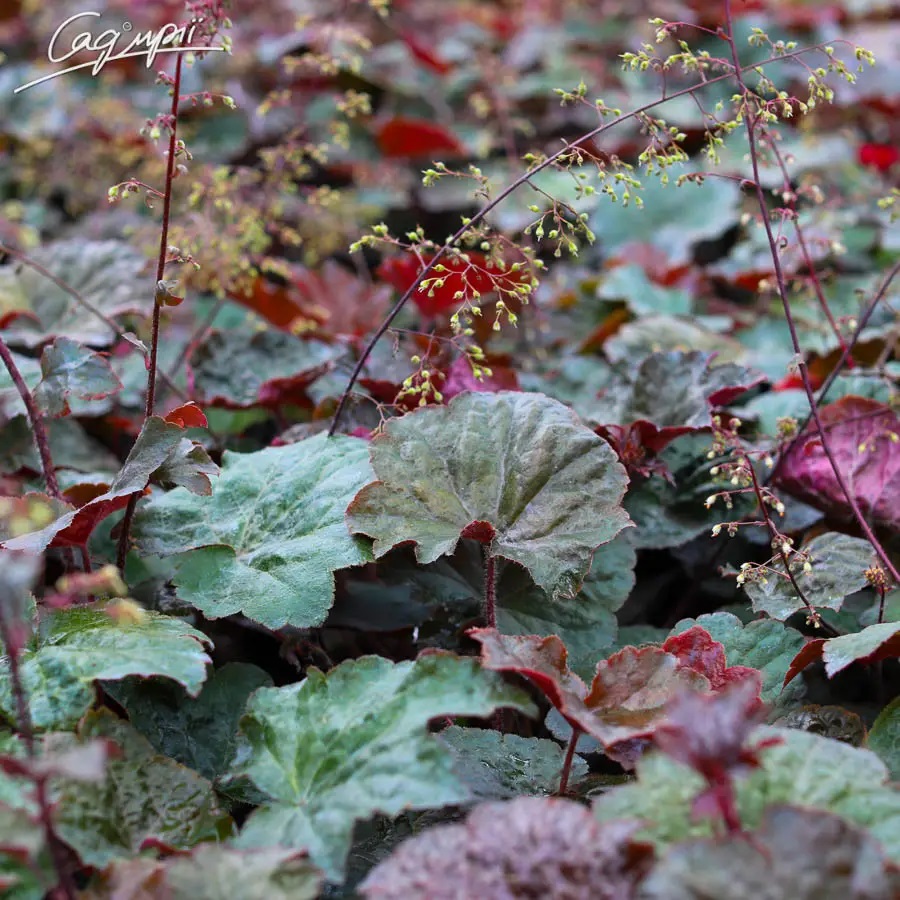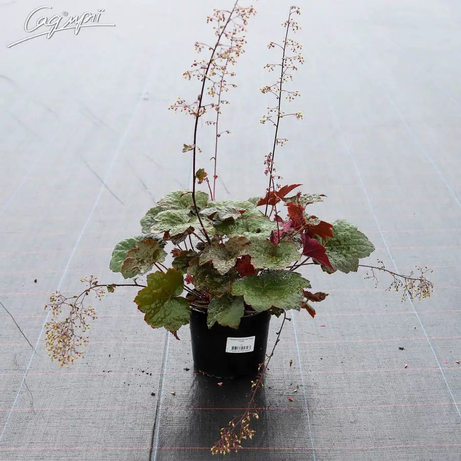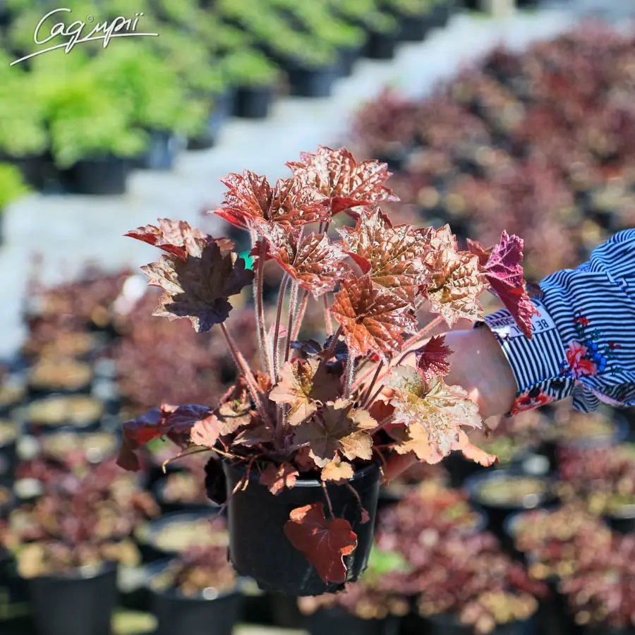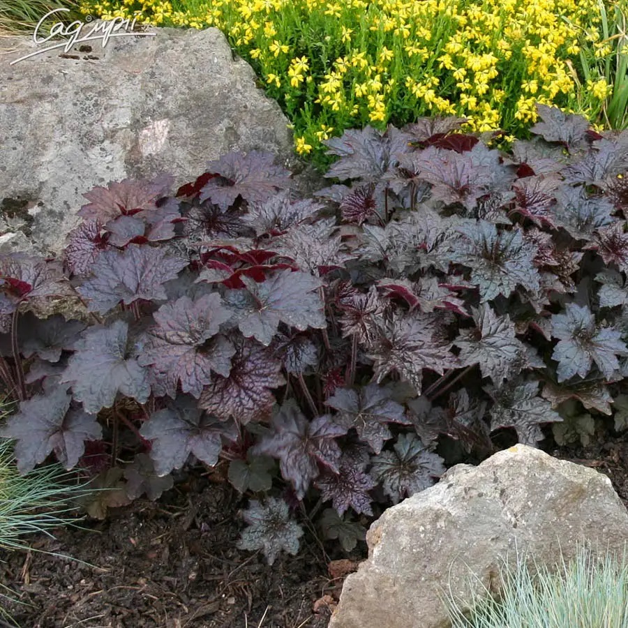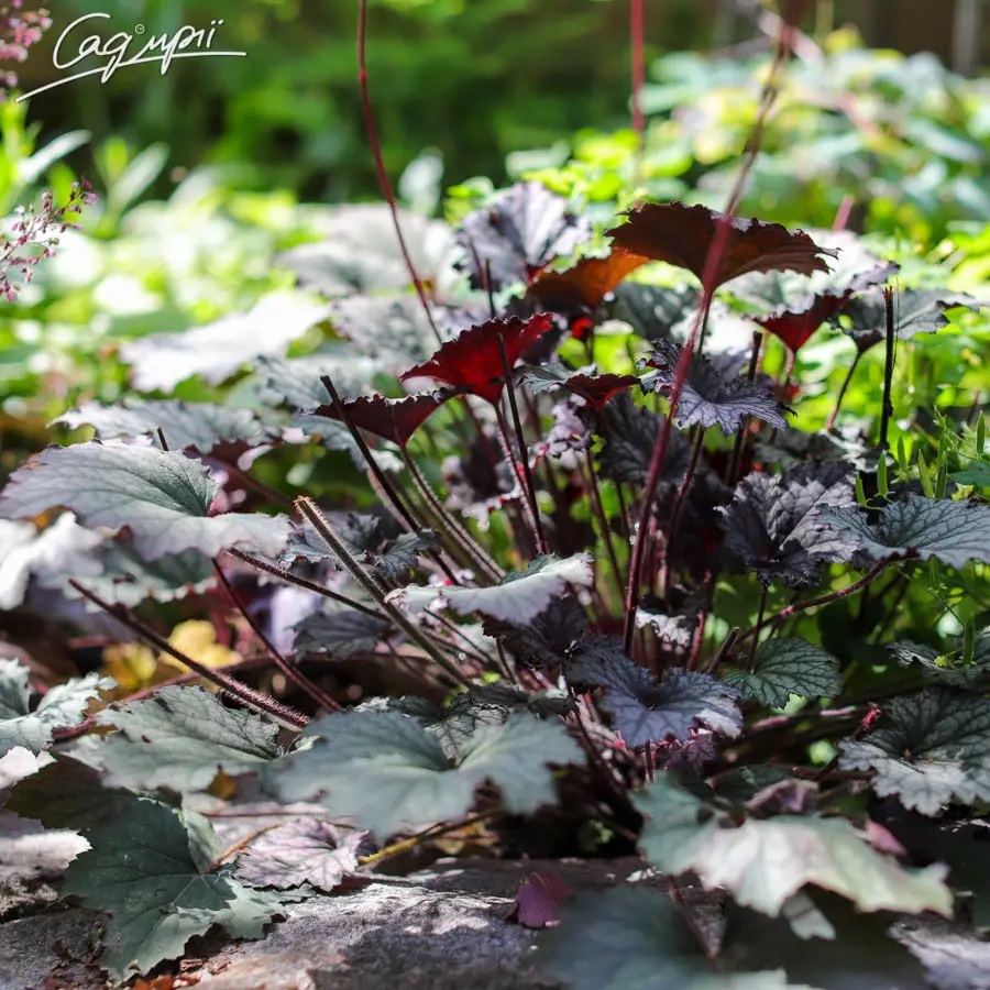 Гейхера 'Palace Purple' - декоративное вечнозеленое многолетнее растение, высотой 30 см, а шириной 50 см. Красивые яркие листья темно-бордового цвета, диаметром 8 - 13 см. Наружная сторона листа пурпурного цвета, а внутренняя - свекольного цвета. Мелкие кремово-бежевые цветы в виде маленьких колокольчиков, собраны в метельчатые соцветия, которые расположены на прямых цветоносах длиной до 45 см и возвышаются над листьями. Цветет с начала июня до середины августа.