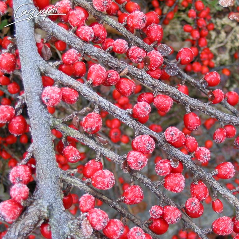 Листопадный кустарник с горизонтальной кроной, скелетные ветви дугообразно отклоняются и разветвляются наподобие рыбьей кости. Во взрослом возрасте достигает до 1 м в высоту, иногда выше, на стенах домов и опорах до 2 м, и почти в два раза шире. Листья округлые,кожистые длиной 1,2 см, с острой верхушкой, глянцевые, темно-зеленые, осенью оранжевые. Цветы бело - красные, собраны по 1-2 на побегах прошлого года, в июне. Плоды красные, округлые, величиной с горошину, появляются в большом количестве и часто до декабря украшают куст. Предпочитает слегка притененные местоположения. Используется одиночно и в группах, в альпинарии, верещатниках, садах на крышах, в кадках.
