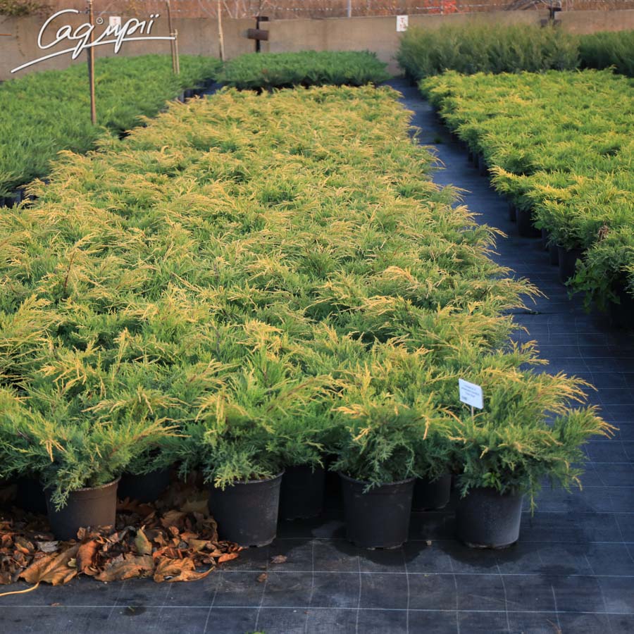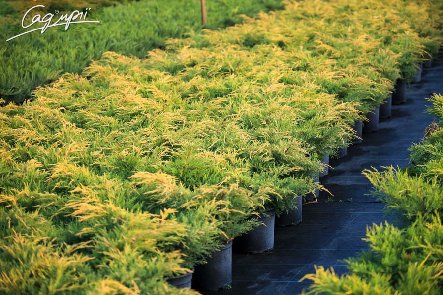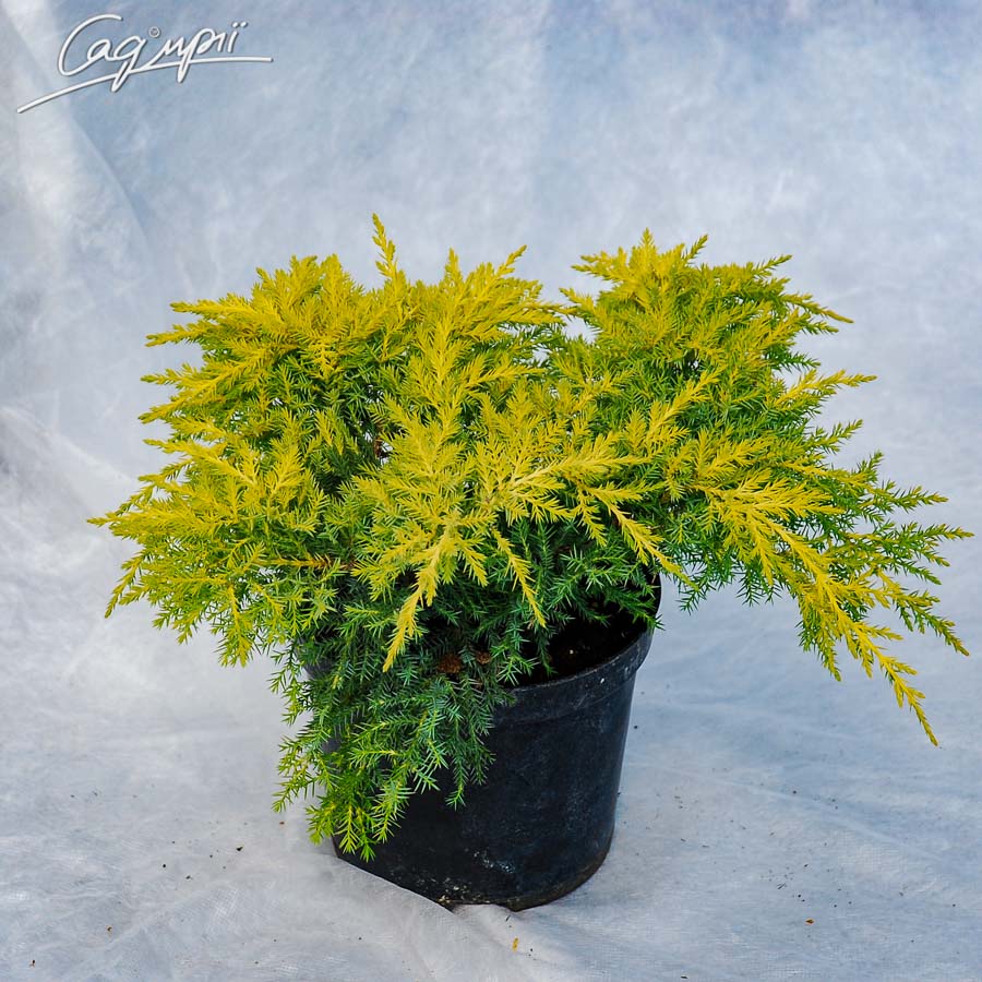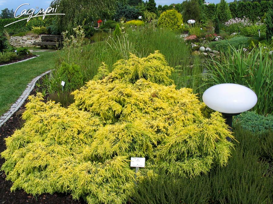 Невысокий декоративный хвойный кустарник с плотной раскидистой кроной, расположенной горизонтальными ярусами. Крона широкая, раскидистая, с горизонтальными, свисающими по концам, побегами. Побеги изогнутые, густые золотисто-жёлтые. Хвоя зеленовато-желтая весьма декоративная, золотисто-жёлтая, зимой темнеет. Высота 0,5 - 1 м, ширина – до 3 м. Скорость роста средняя. Требования к почве и влаге не высокие. Предпочитает солнечные места и хорошо дренированные плодородные почвы, в тени потеряет золотистую окраску. Морозостоек. Практически незаменим для составления низкорослых живых изгородей, а также для высадки в миксбордерах. Выиграшно смотрится в паре с колоновидными формами.