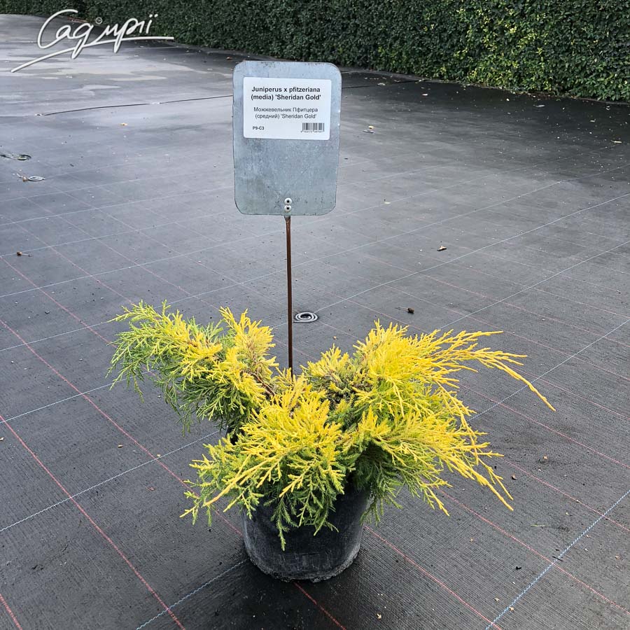 Можжевельник средний 'Sheridan Gold' лучше всего высаживать на солнечных местах. Растение из контейнера перед посадкой следует тщательно пролить водой. Подготовить посадочную яму в 1,5-2 раза больше корневой системы. Для лучшей приживаемости желательно заменить почву на питательную смесь: песок, дерновая земля, торф, соотношение 1:1:1., или взять готовую почвосмесь (торф) для хвойных растений, перемешать с почвой 1:1. Можно добавить комплексное минеральное удобрение. Этот переходный слой будет способствовать лучшему прорастанию корней в почву. Если почва тяжёлая или близко залегают грунтовые воды, обязателен дренаж из гравия или битого кирпича слоем 20 см. При посадке корневая шейка можжевельника должна быть на уровне земли.