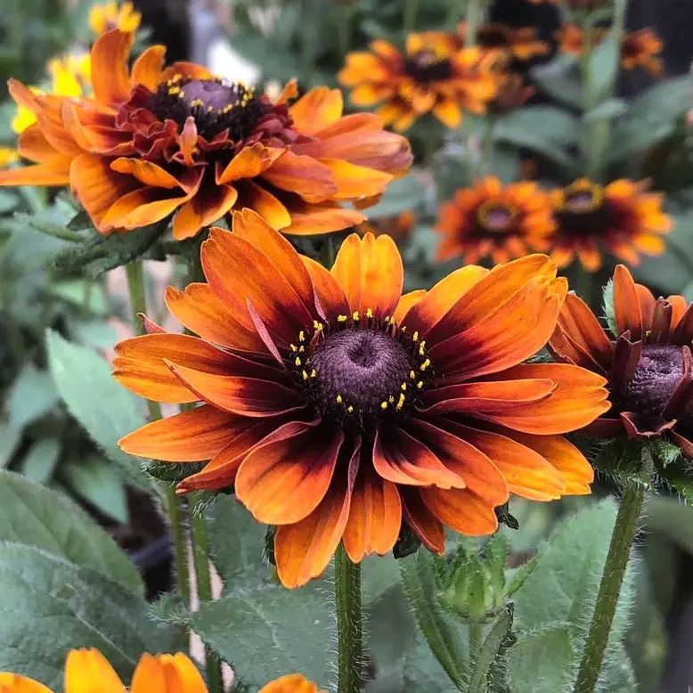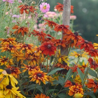 Цветение рудбекии «Cherokee Sunset» обычно очень обильное и продолжается с начала лета до самых заморозков. Размер цветов достигает 7-10 см в диаметре!