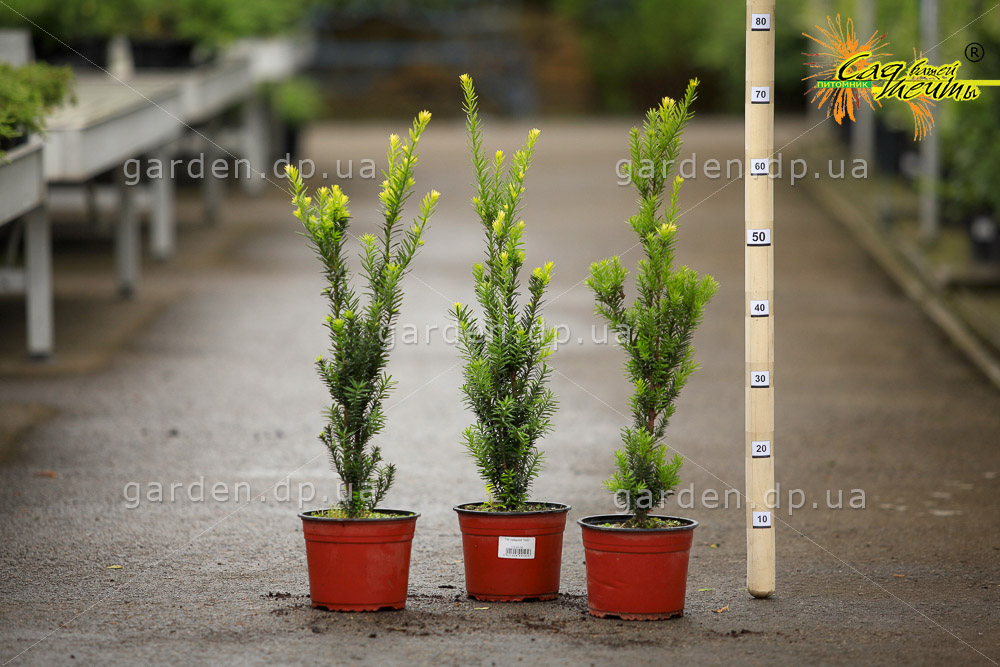 Вічнозелений густо-розгалужений, компактний, широкопірамідальний великий чагарник зі строго вертикальними гілками. Бічні пагони короткі, з віком вазоподібні і переплетені один з одним. Росте повільно. Висота 3-5 м. і ширина 2-3, 5 м.річний приріст у висоту 10-15 см., в ширину 10 см. Хвоя голчаста, блискуча, світло-зелена, знизу сіро-зелена, коротко загострена. Чи не плодоносить. Тіньовитривалий, росте на всіх свіжих або вологих, родючих, дренованих грунтах, кислих або сильно лужних. Морозостійкий. Застосовується поодиноко і в групах, ідеальний для вічнозелених живоплотів.