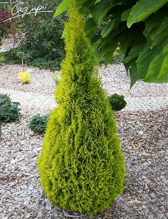 різновид відомої туї західної. Швидкозростаючий конусоподібний хвойний чагарник, висотою близько 3м.Хвоя золотисто-жовта, практично не змінює кольору взимку. До грунтів невимоглива, але вважає за краще свіжі, досить зволожені родючі. Може добре рости як на світлі, так і в півтіні, але на сонячних місцях колір хвої більш яскравий. Морозостійкий. Від опіків ранньою весною практично не страждає.