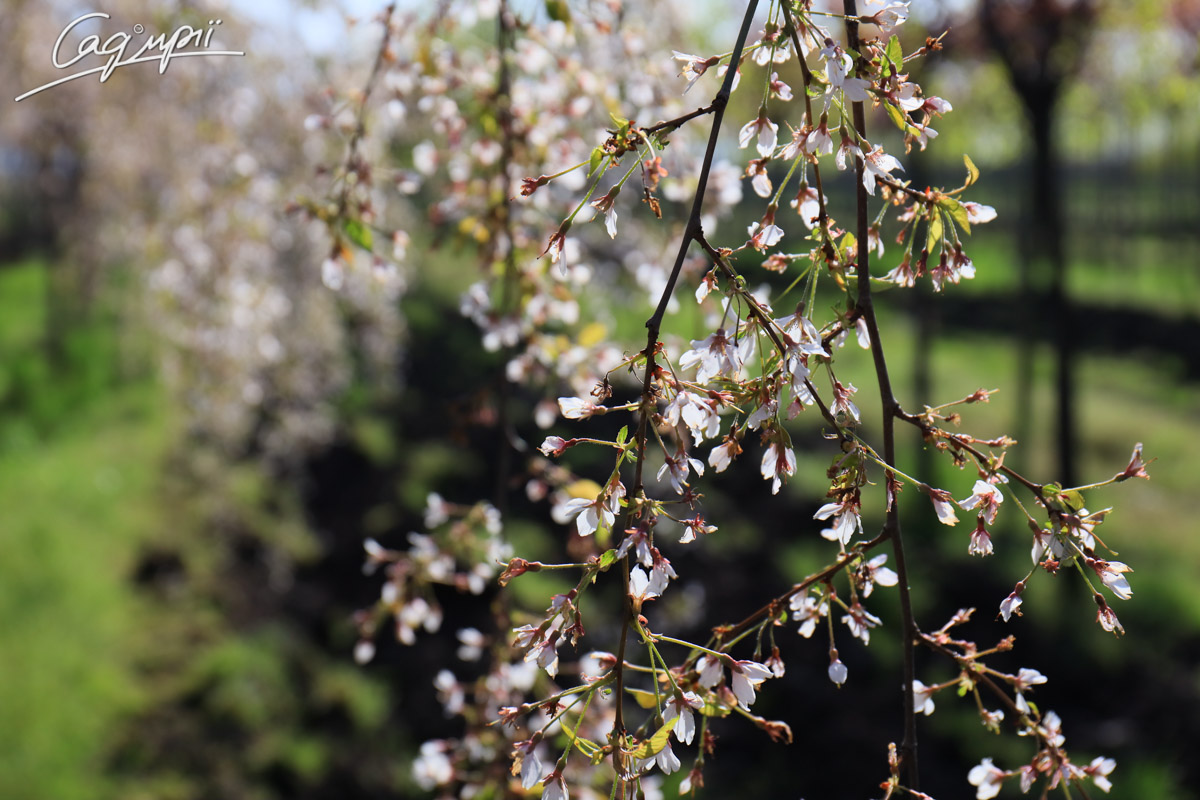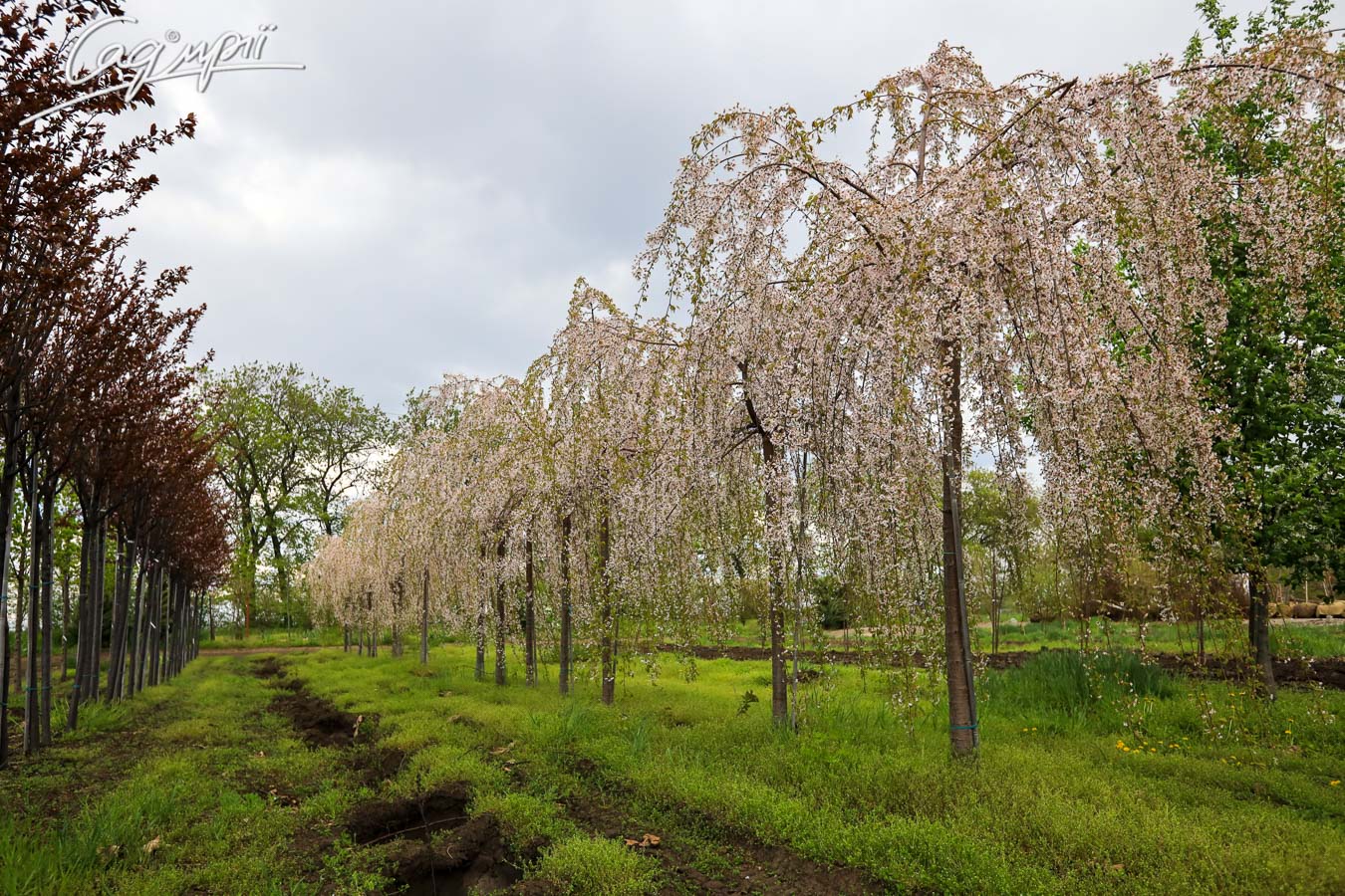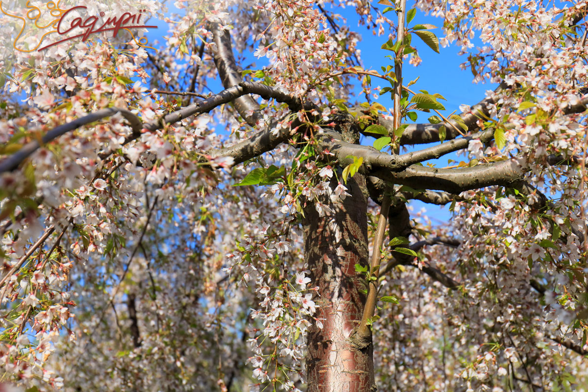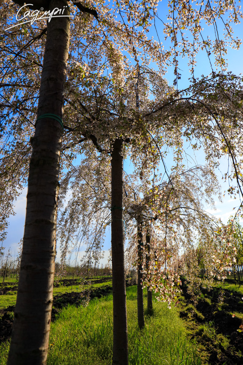 Листопадне невелике дерево з широкою зонічною кроною і звисаючим каскадом кінчиками гілок. Швидкість росту низька. Досягає висоти 3-4 м, ширина до 4 м, річний приріст 20-30 см. Листя трохи ширше, ніж у інших сакур. Квіти прості, діаметром до 2 см, з'являються у великій кількості в квітні. Світлолюбива. До грунтів невимоглива, росте на всіх культивованих садових грунтах, потребує свіжих, вологих, багатих поживними речовинами, піщано-глиністих субстратів, від нейтральних до сильно лужних.